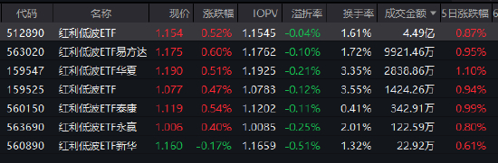 1月26日,A股三大指数涨跌不一,沪指早盘收涨0.12%,深成指与创业板指则高开低走,盘中一度跌超1%。在此市场环境下,红利低波ETF(512890)上涨0.52%,报收1.154元,换手率为1.61%,成交额达4.49亿元。