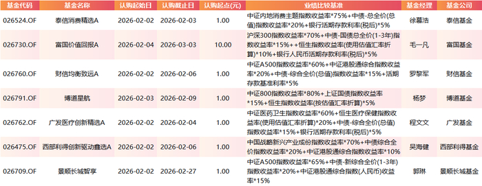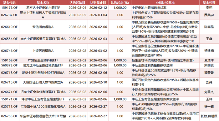 从认购期看,部分产品认购窗口较短(如2月2日至2月6日),亦有产品开放认购至2月底或3月初,投资者可根据自身安排灵活选择。从认购门槛看,除易方达中证电池主题ETF、易方达中证全指红利质量ETF、博时中证工业有色金属主题ETF等部分ETF直接设置1000元认购起点外,多数联接基金及主动管理型产品认购起点仅为1元,低门槛设计进一步贴近个人投资者。易方达、鹏华、南方、博时、招商、银华等多家公募机构均有新品推出,显示其对当前市场结构性机会的积极布局。