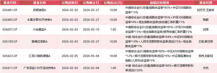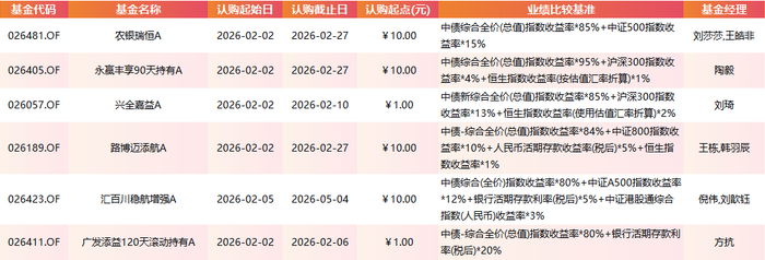 重点产品看,农银瑞恒A:权益部分聚焦中证500,侧重中小盘成长风格,适合看好中小盘弹性增强的投资者。永赢丰享90天持有A:权益仓位较低(5%),且以沪深300为主,风格更稳健,适合短期资金配置。汇百川稳航增强A:认购期最长(至5月4日),配置涵盖A股、港股与存款,结构较为均衡。广发添益120天滚动持有A:唯一未配置权益的纯债产品,适合风险偏好极低的投资者。
