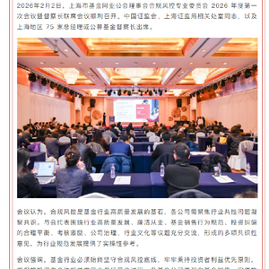 2026年2月2日,上海市基金同业公会理事会合规风控专业委员会2026年度第一次会议暨督察长联席会议在上海召开。来自中国证监会、上海证监局相关处室负责同志,以及上海地区75家基金公司总经理或公募基金督察长出席会议。