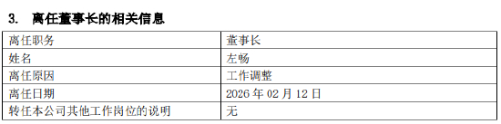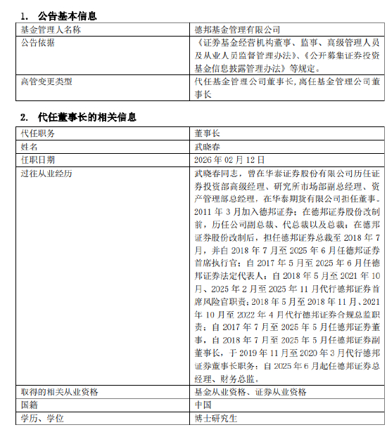 2月14日,德邦基金发布公告,因工作调整,左畅不再担任公司董事长职务,未转任公司其他工作岗位。经董事会审议通过,德邦证券总经理、财务总监武晓春自2月12日起代行公司董事长职责,本次调整已按规定履行备案手续。