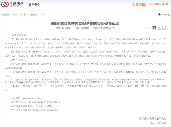 2月15日,在经历了一场因国际白银市场“史诗级”暴跌引发的估值调整风波后,国投瑞银基金正式公布了针对受影响投资者的专项和解方案。根据方案,超九成的自然人投资者将获得估值调整影响金额的全额补偿,相关在线办理渠道将于2月26日正式启用。