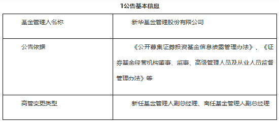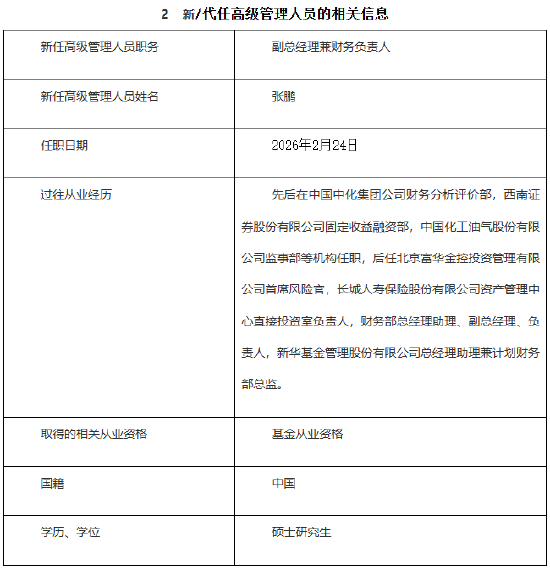 近日,新华基金发布基金行业高级管理人员变更公告,任期15年9月,副总经理兼首席信息官徐端骞因个人原因离任,新任张鹏为副总经理兼财务负责人,任职日期2026年2月24日。