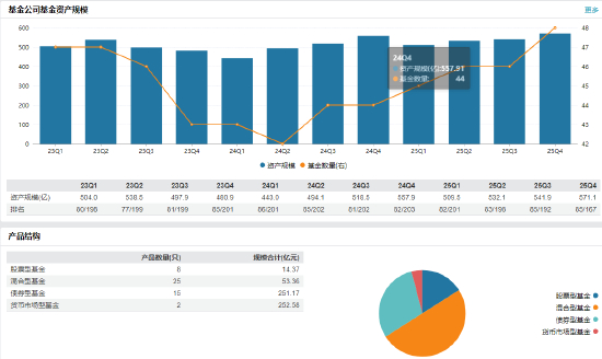 新华基金成立于2004年12月9日,是我国西南地区第一家公募基金管理公司。公司注册地为重庆,经营管理中心位于北京。目前股东结构为:恒泰证券持股52.99%,北京华融综合投资持股43.18%,杭州永原网络科技持股2.10%,重庆市江北区国有资本投资运营管理集团持股1.73%。截止2025年12月31日,资产规模571.1亿元。非货币资产规模318.49亿,排名90/164位。从产品结构来看,呈现显著的“债强股弱”特征,债券型基金规模达251.17亿元,占非货规模近八成,而权益类产品合计不足70亿元。