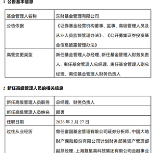 2月28日,东财基金管理发布高级管理人员变更公告,沙福贵因工作安排离任总经理、财务负责人,副总经理顾勇升任公司总经理、财务负责人,任职日期2026年2月27日。同日,沙福贵亦不再担任公司第三届董事会董事职务,由顾勇接任董事席位。