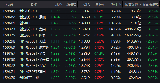3月3日,A股市场整体震荡调整,主要指数高开低走。截至收盘,深证成指下跌超3%,创业板指跌逾2%,科创50指数跌幅超过5%。受此带动,创业板50ETF(159949)收跌2.27%,报1.509元,换手率8.78%,成交额达19.73亿元,在同类标的ETF中位居首位。