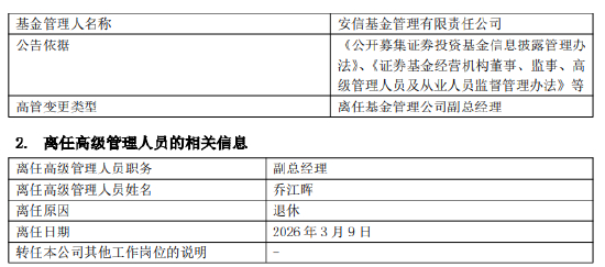 3月10日,安信基金发布高级管理人员变更公告,副总经理乔江晖退休离任,离任日期2026年3月9日。安信基金在公告中以一句“公司对乔江晖女士在任职期间做出的贡献表示衷心感谢”,为这位在安信体系内奋斗了十四载的“开朝元老”职业生涯画上了圆满的句号。