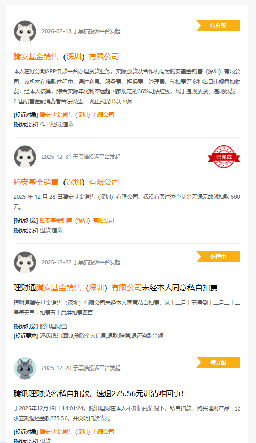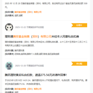 有投诉人表示,“2025 年 12 月 28 日腾安基金销售(深圳)有限公司,我没有买过这个基金无缘无故就扣款 500 元。”“理财通腾安基金销售(深圳)有限公司未经本人同意私自扣费,从十二月十五号到十二月二十二号每天早上扣费五十总共扣费四百”。