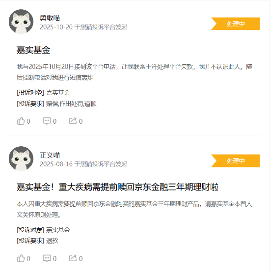 有投诉人表示,“本人因重大疾病需要提前赎回京东金融购买的嘉实基金三年期理财产品,请嘉实基金本着人文关怀原则予以退款。”另一位投诉人则表示,“我于2025年10月20日接到电话让我处理该平台欠款,随后又对我进行短信轰炸”。