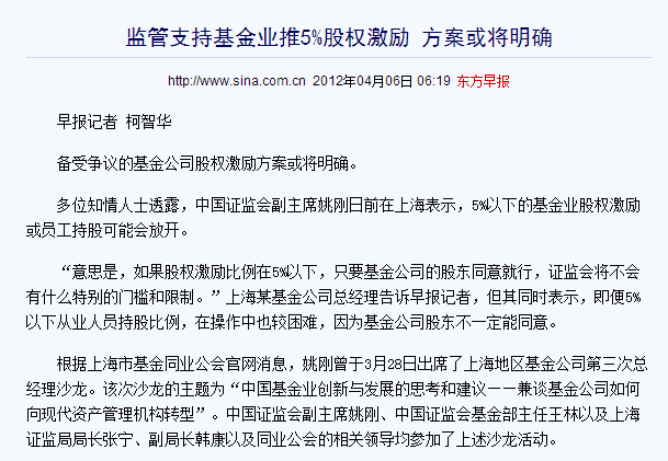 2012年,维基君还是东方早报记者时,曾对监管层支持公募基金实施股权激励,进行了独家报道。