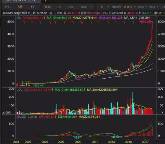 在王亚伟清仓之后不到半年,贵州茅台完成了历史筑底,从最低点的25.68(2003年9月),上涨到复权后的1046.83元(2008年1月),到周五收盘,贵州茅台复权后的价格更是达到了4859.56 。