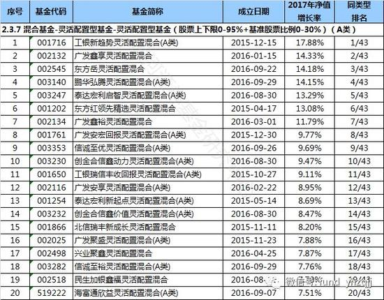 (11)在2.3.7灵活配置型基金(股票上下限0-95%+基准股票比例0-30%)(A类)中,工银新趋势灵活配置混合(A类)(基金代码:001716)以17.88%的收益率排名第一,同类型基金业绩今年以来平均上7.22% 。