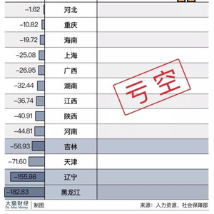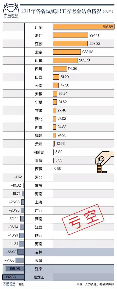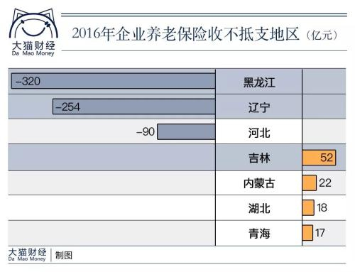 从中不难发现:老工业基地的东三省养老保险基金的支出远远大于支出,黑龙江亏空182.83亿,辽宁亏空155.98亿,吉林亏空56.93亿。另一个国企众多的直辖市天津,当年的亏空也在71亿。