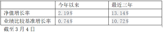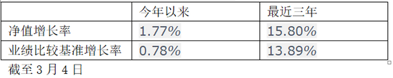 业绩:自2018/02/03任职至2019年3月6日,任职总回报0.75%,同期沪深300为-9.91%,wind同类排名632/1613。