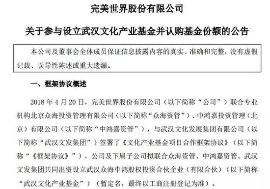 而众海鸿嘉或脱胎于一只主投武汉文化产业的基金。根据完美世界去年4月底发布的公告,完美世界联合众海投资、中鸿嘉投资以及武汉文化发展集团有限公司,共同出资设立武汉众海中鸿股权投资合伙企业(有限合伙)(暂定名)。这是一只武汉文化产业基金,总规模为5亿元,将重点投资武汉市及中国境内的影视、文化、娱乐等行业内的优秀项目和公司。
