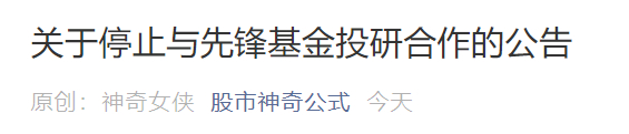 9月23日,天风天成资管的“股市神奇公式”公众号发布消息,停止与先锋基金投研合作。