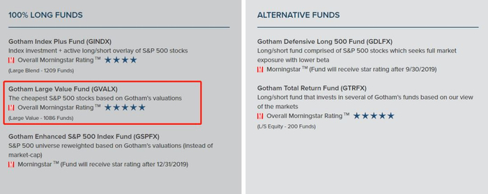 从该公司的网站看,其精选的基金出现不少指数增强型产品。而重点推荐的主动基金Gotham Large Value Fund (GVALX)自成立至8月底业绩并未跑赢标普500。