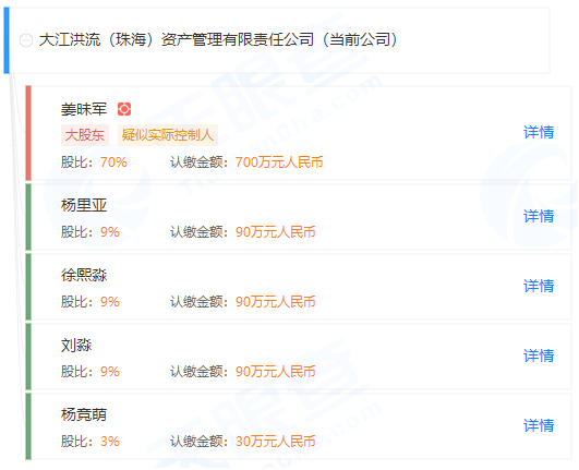天眼查信息显示,大江洪流(珠海)资产管理有限责任公司目前最大的股东是姜昧军,持股占比70%,另外公司副总经理杨里亚、徐熙淼分别持股9%。
