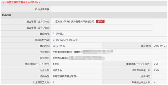 基金业协会信息显示,10月10日,大江洪流(珠海)资产管理有限责任公司完成私募证券投资基金管理人备案,该私募在今年7月4日刚刚成立,注册资本是1000万,实缴25%。目前公司有4个员工,注册在广东珠海横琴,办公在北京石景山。