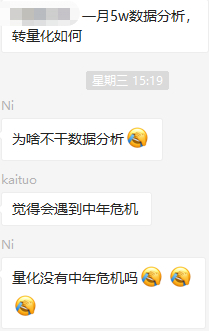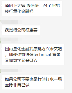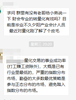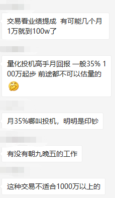 虽然,要求特别高,看着海外量化机构的威风八面、光明前途。国内资管机构的量化交易岗,也是“大热门”,上述提及的量化社群中,不时有人谋求转行的咨询信息。