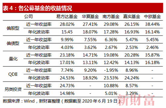 对于首批试点投顾业务的5家基金公司,新财富统计比较了其最近一年的基金收益率,偏股型、偏债型、量化、QDII及另类投资基金中收益率最高者,易方达基金、中欧基金各占2类、华夏基金占1类(表4)。