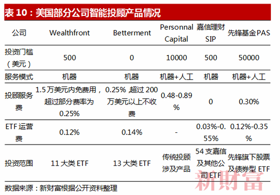 未来,基金投顾产品的费率或存进一步下调的可能。参照海外,无论是规模数一数二的先锋基金,还是近年来崛起的智能投顾新秀wealthfront等财富管理平台,其智能投顾产品综合费率普遍在0.35%-0.8%之间(表10)。嘉信理财的智能投顾平台SIP(Schwab Intelligent Portfolios)则直接取消投资顾问费,仅收取ETF相关运营费用。另据SEC统计,美国平均投顾服务费率区间为 0.5%-1.2%。