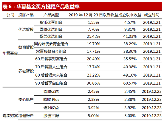 但是,由于我国主动型基金仍具备赚取超额收益的能力,因此,公募机构或不会如海外机构一样过多配置ETF。以产品收益率更高的华夏基金为例,其偏中高风险的7款投顾产品中,ETF的综合占比仅为2.7%。