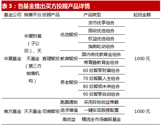 “以客户需求为中心”,是基金投顾产品的最大发力点。目前,华夏、南方、中欧、嘉实等基金公司均已推出相应产品。它们的特征是:1、多重产品组合,进取、稳健、保本兼顾;2、关注投资者的教育、养老心理,满足热点需求;3、大部分产品的起投金额为1000元(表3)。