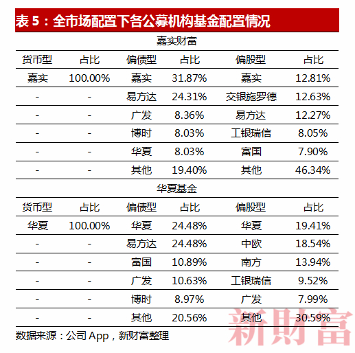 就目前各机构基金投顾产品的配置情况看,华夏基金及嘉实财富的全部产品,以及中欧基金的部分产品已率先突破,实现了全市场配置。如华夏和嘉实财富只在收益差距不大的货币型基金中会优先考虑自家产品,而在配置偏股型及偏债型基金时,对自家基金产品并不偏倚(表5)。