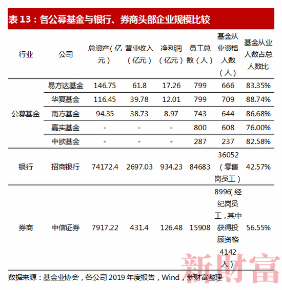 过去,由于公募基金的直销渠道通常对接B端,与C端距离较远,因此,前端投顾人数、线下网点等布局,与银行、券商等金融机构差距悬殊。如招行拥有3.6万名零售岗员工,中信证券有近9000名经纪岗员工,其中超过4000人获得投顾资格,而基金公司中员工人数最高的嘉实基金,获得基金从业资格的只有608人(表13)。