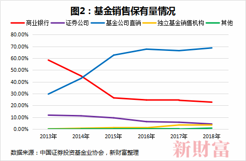 对公募机构而言,过去,其基金直销保有量的增长,很大程度上源于委外基金及各类定制型基金等需求的增加,但C端市场的话语权仍掌控在银行等代销渠道手中(图2)。作为参照,2018年,公募基金中个人资金占比为49%,金融同业资金及企业资金占比则分别达到41%、10%。