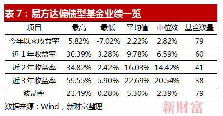 截至2020年5月28日,易方达仍在运行的偏债型基金(包括偏债混合型基金)共有81只,其近3年收益率均值为22.69%,中位数为20.54%,而波动率中值仅为2.39%(表7)。以此,易方达基金的债券型基金产品才成为各机构竞相配置的对象。