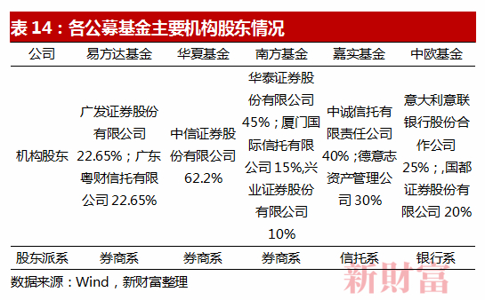 但对于公募机构而言,扩充投顾团队不仅需要增加人力开支,还要投入更多资源以建设线下渠道,因此从财务角度考虑,短期内补齐人员短板并不实际。当下,利用股东资源,建立渠道协同机制,或是公募基金补齐人员短板的突破口之一。首批试点的5家基金公司中,易方达、华夏及南方均有券商股东背景,而嘉实、中欧则分别有信托及银行股东背景(表14)。