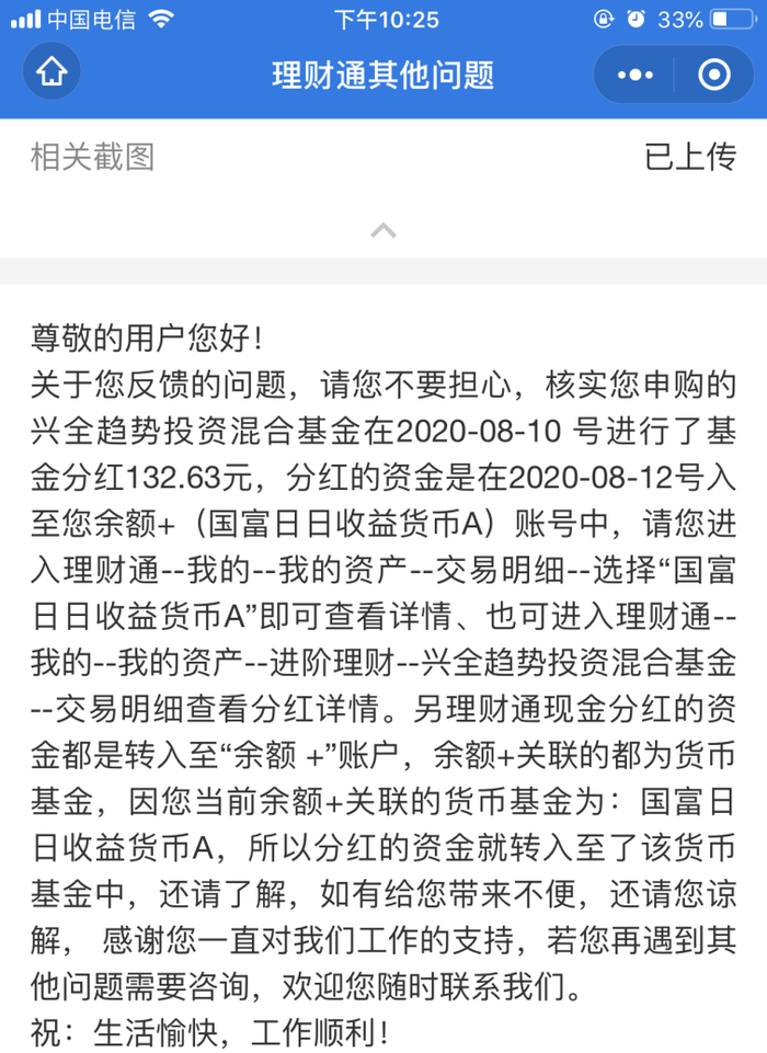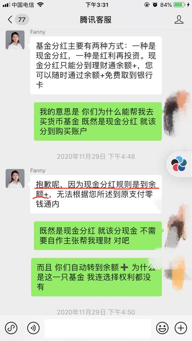 通过咨询腾讯客服,张明发现,原来是自己通过理财通购买的基金进行了现金分红,而分到的资金直接拨入余额+账户,自动为客户购买了货币基金“国富日日收益货币A”。