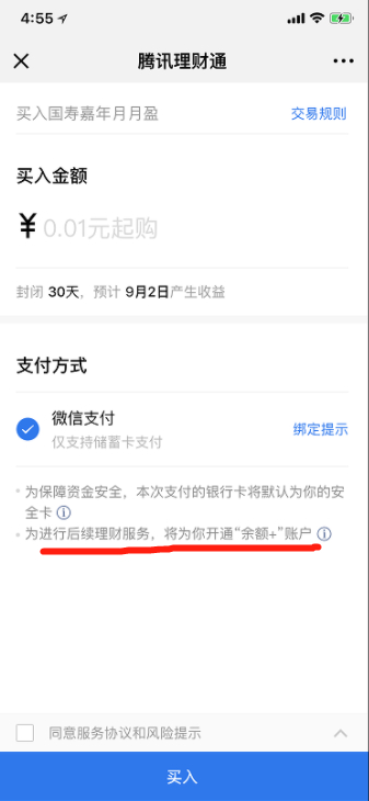 至于余额+的开通状况,上述工作人员表示,在使用理财通购买基金产品时,用户会收到开通余额+账户的提示,甚至特别提醒余额+账户开通时会直接确定默认产品(以开通时7日年化最高的货币基金作为默认),而投资人也可在余额+中更换默认货币基金。