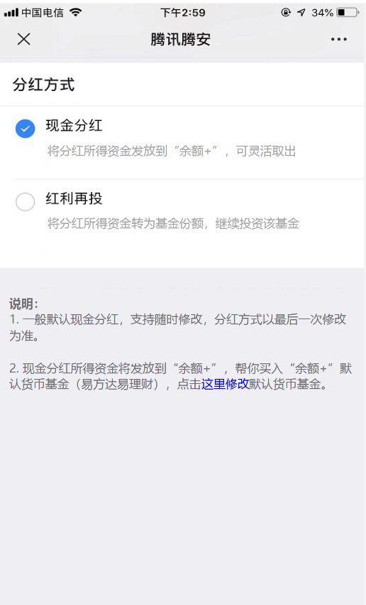 针对这些问题,中证君采访了腾讯方面。有关工作人员说,在分红选择方式界面上,现金分红一栏下面明确写着“将分红所得资金放到余额+,可灵活取出”。界面下方还有对分红方式的补充说明,提示用户修改余额+的默认产品。