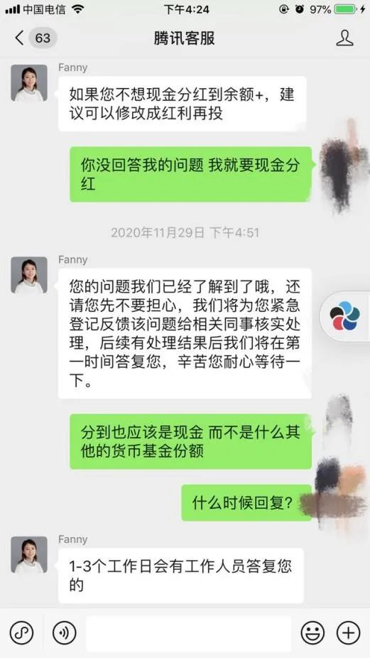 面对追问,客服人员多次解释货币基金可以随时取出,并不会实际上给投资人造成损失,但对于张明的质疑,该客服人员并未给予正面回答,而是许诺1-3个工作日给予回复。但此后,张明并没有收到回复。