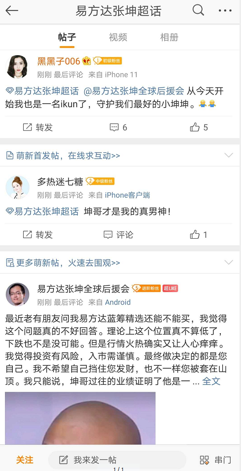 支付宝基金销售平台的讨论区,都是一片“ikun”膜拜张坤的声音:“相信坤哥!” “xxx(某基金经理名字),不用选股了,重仓坤哥的基金就行了。” “坤哥就是大涨小跌,最爱坤哥!”还有基民编出了顺口溜:“完全不虚!跟着坤哥买,别墅靠大海!”