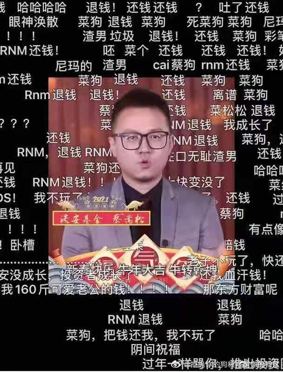 例如,在蔡嵩松一则新年祝福的视频里,弹幕却铺天盖地的充斥着“菜狗”、“RNM”、“渣男”、“垃圾”等侮辱性词汇。还有网友在基金讨论区要求:“蔡嵩松快出来向投资者道歉,退出基金行业,别坑害基民了好吗。”