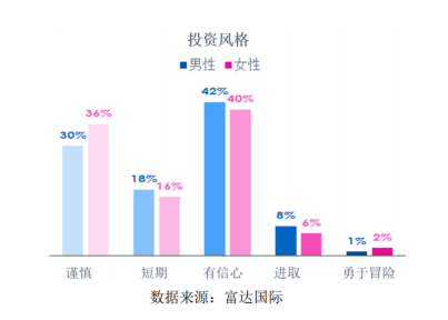 有36%的女性投资者表示她们会采取保守的投资风格,将避免损失作为第一要务。而更多的男性则认为他们对投资抱有信心,这一比例达到了42%,明显高于女性。