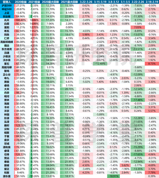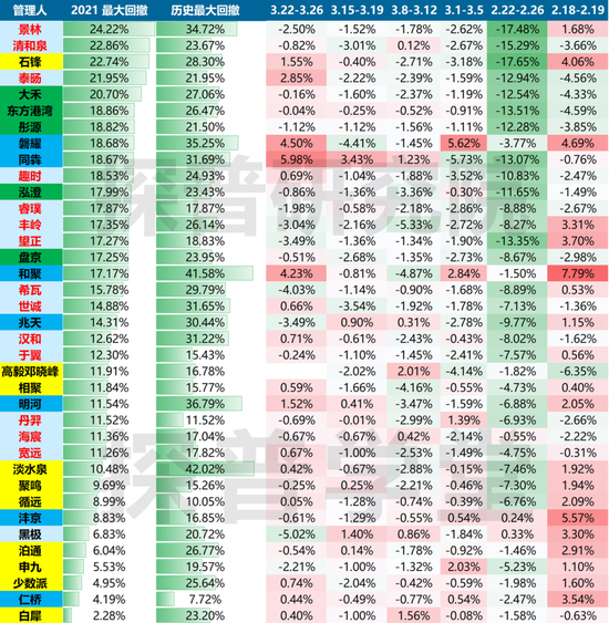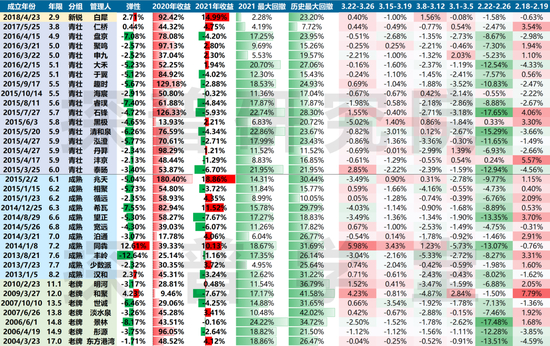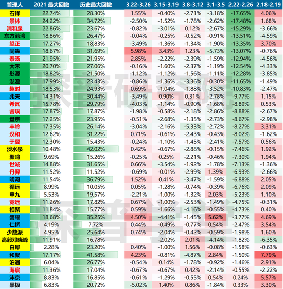 重点观察的是:每家私募在2020年和2021年收益的变化情况,特别是春节后抱团瓦解行情下,伴随着股票市场的深度回调,在2020年收益表现优异的私募基金,面对极端行情时的表现。
