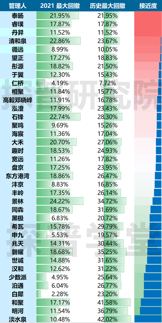 而接近度最低的淡水泉,本次回撤也已经达到10%以上,但因为历史最大回撤高达42%,因此看上去有更大的缓冲。整体来说,接近度和绝对值比较理想的是:丹羿、循远、仁桥、于翼、高毅的邓晓峰、相聚、聚鸣等都不错。