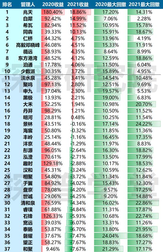 2020年,排名前10位收益区间是180.4%到78.08%,排名11到20位的收益区间是76.59%到48.52%,排名21到30位的收益区间是48.44%到37.04%,排名31到37位从30.35%到9.46%。四个收益区间 中,排名前10位的首末差距最大。