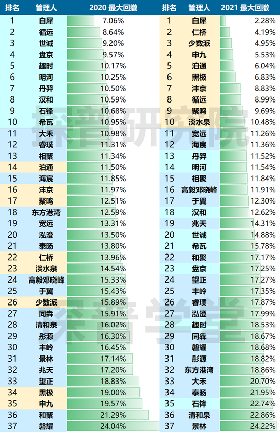 我们把这两年最大回撤数据降序排列,2020年最大回撤最小的10家私募分别是:白犀、循远、世诚、盘京、趣时、明河、丹羿、汉和、石锋、希瓦。2021年至今最大回撤最小的10家私募是:白犀、仁桥、少数派、申九、泊通、黑极、沣京、循远、聚鸣、淡水泉。