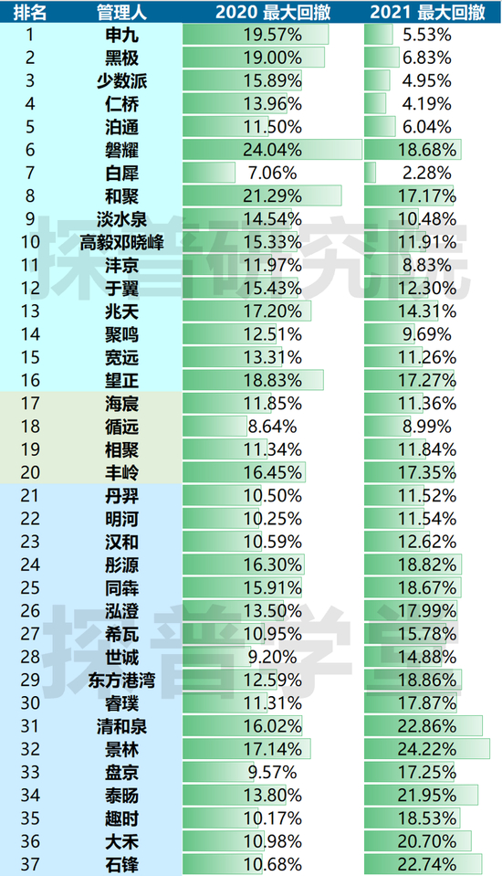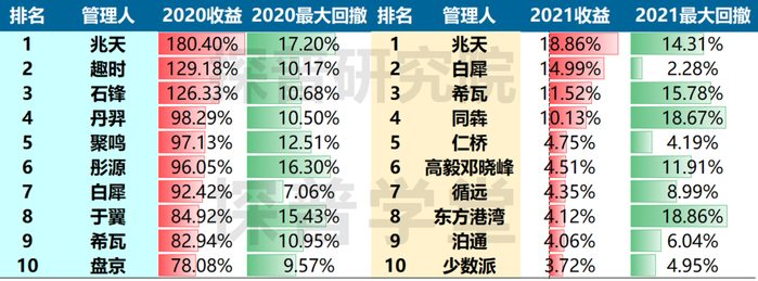 2. 2020年收益排名前10的私募,进入2021年后有7家跌出前十排名。2020年回撤控制最出色的前10位中有8家跌出前十排名。