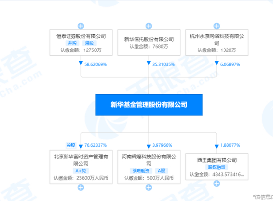 作为一家老牌基金公司,新华基金目前的注册资本为21750万元,法定代表人为张宗友。天眼查数据显示,从股权结构情况看,恒泰证券以58.62%的持股比例位居新华基金第一大股东。此外,新华信托股份有限公司和杭州永原网络科技有限公司分别持股35.31%和6.07%,为第二大股东和第三大股东。