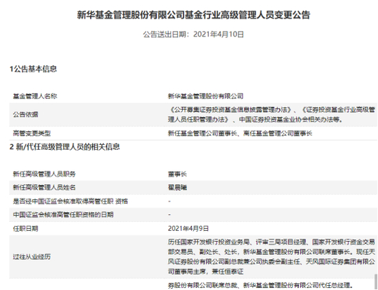 4月10日,新华基金发布公告称,新华基金原联席董事长翟晨曦升任至公司董事长,对公司进行全面管理;而原董事长张宗友则转任至公司联席董事长,对公司进行辅助管理。
