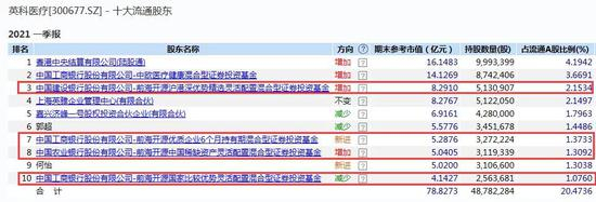 Wind数据显示,英科医疗2020年年报扣非归母净利润同比增长高达4045%,今年一季度末,基金持有3037万股,占比12.75%。在公司前10大流通股东之中,出现了5只公募基金产品,其中“医药基金女神”葛兰旗下的中欧医疗健康混合型一季度增仓100万股位居第2大流通股东,而第3、7、8、10大流通股东则由前海开源的4只基金产品占据。