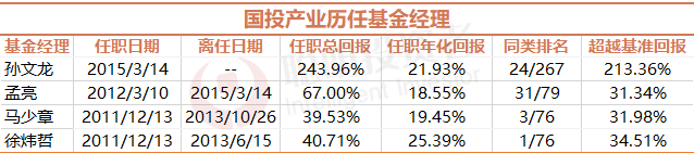 国投产业历年的基金经理也都还不错,特别是现任基金经理孙文龙,从2015年3月管理至今,获得了243.96%的总回报,年化回报接近22%。