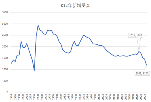 证星研究院研究得出,到2025年整个K12的新增需求量会萎缩至当前的67%!显然这一波在线教育的繁荣有很多泡沫,只是长期下跌前的一次伪复苏。
